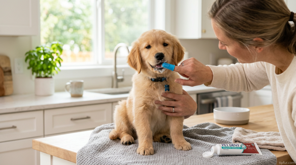 • Introduce dog‑safe toothpaste and a soft toothbrush.